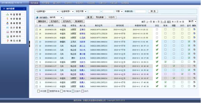 3、 預(yù)約確認(rèn)后,生成預(yù)約號(hào),就診時(shí),需憑預(yù)約號(hào)領(lǐng)取門診號(hào)就診。 后臺(tái)管理功能描述 1、 修改、取消患者預(yù)約信息。 2、 領(lǐng)取門診號(hào)后,需銷號(hào)。(建議在門診系統(tǒng)的操作界面中套嵌銷號(hào)界面,且留有數(shù)據(jù)接口) 3、 統(tǒng)計(jì)、查詢功能:可根據(jù)管理的需要,隨意進(jìn)行各類定制的統(tǒng)計(jì)和查詢。